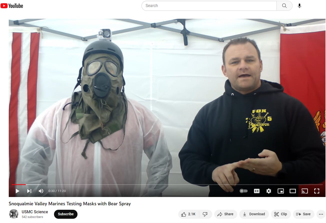 You can easily see for yourself that masks can’t work in this classic video of two Marines using bear spray to test masks