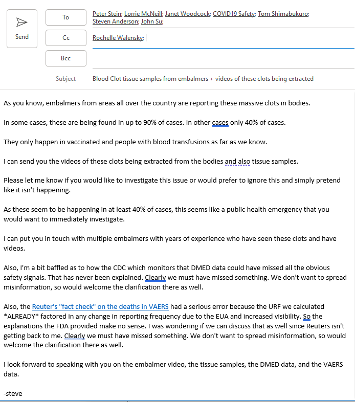 My offer to share videos and blood clot tissue samples from multiple embalmers with the CDC and FDA