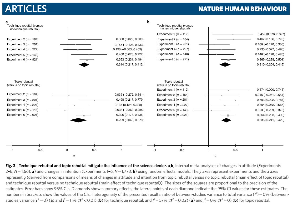 “In the light of these findings we recommend that advocates for science train in topic and technique rebuttal. Both strategies were equally effective in mitigating the influence of science deniers in public debates.”