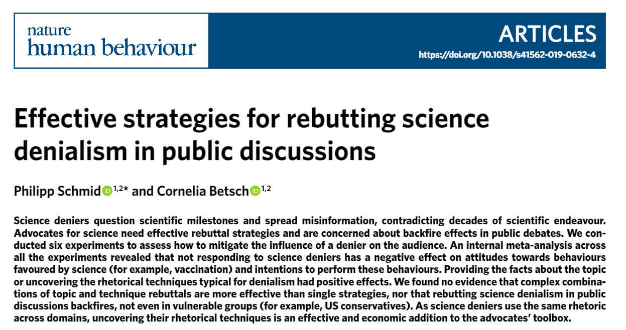 “Altogether, the results do not support the backfire hypothesis in attempts to rebut science denial in public discussions. Instead, the results suggest that both topic and technique rebuttal as single strategies or as a combined strategy can reduce the impact of a science denier. Moreover, it is especially beneficial to use rebuttal strategies among audiences whose prior beliefs or ideology render them particularly vulnerable to science deniers.”