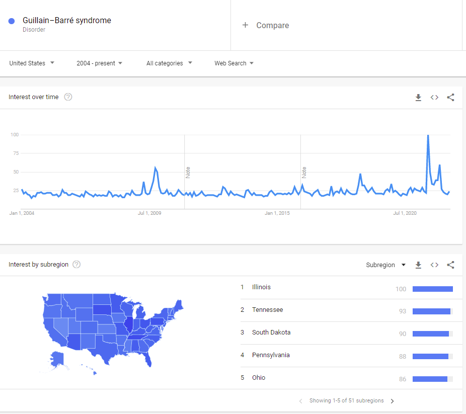 This became popular only after the vaccines rolled out in July 2021. But Gavin Newsom didn’t develop GBS until the end of October, 2021. Strange, isn’t it? See that second peak to the right of the main peak? That’s Gavin’s peak.
