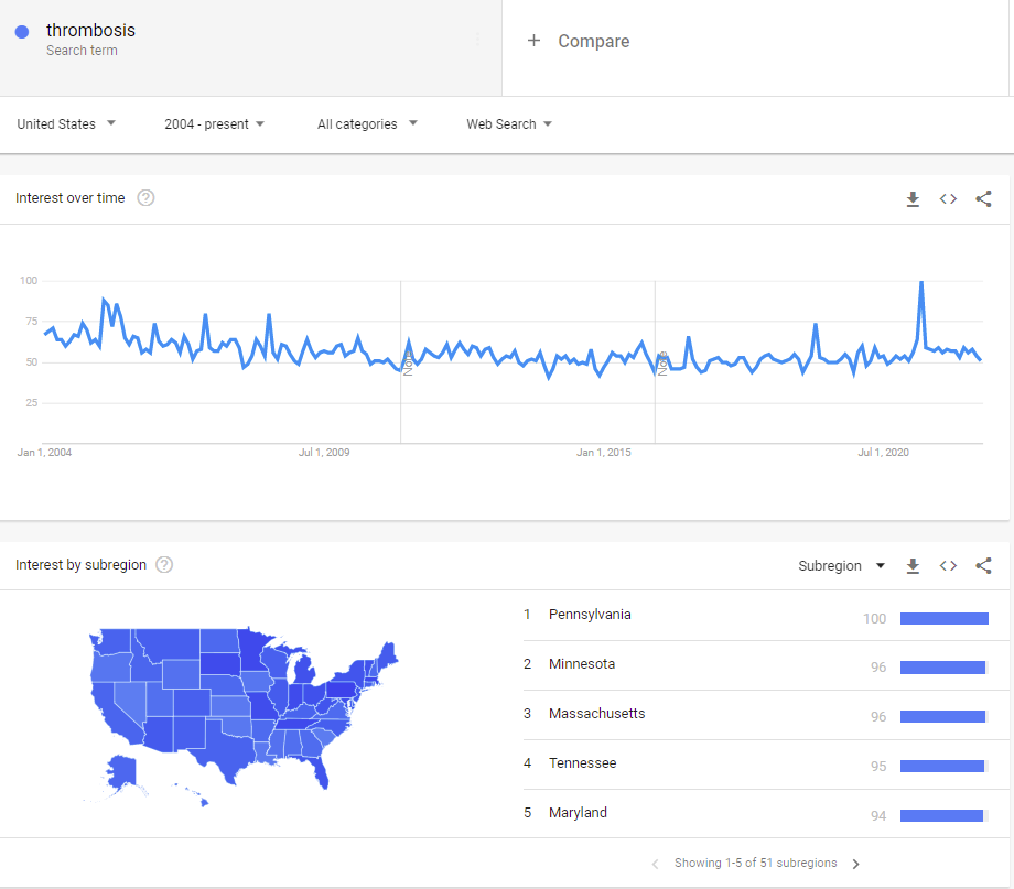 Super popular search term in April 2021 throughout the US. I wonder why? It’s the technical term for blood clots. Weird that people would suddenly take an interest in blood clots. This is before the misinformation spreaders started talking about it, so that wasn’t it. I wonder if people were looking at what was happening to them?