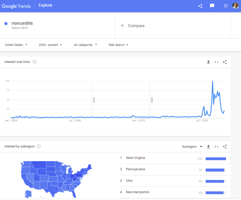 And why did the searches for myocarditis start to rise in March 2021 when vaccines became available for 18-year-olds and really went ballistic right before the May 1 deadline set by Biden for availability for 18-year-olds and older in all states.