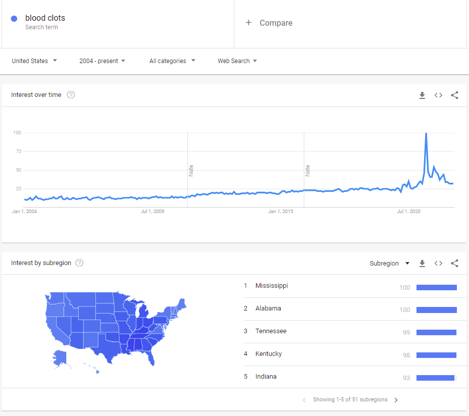 Why are blood clots suddenly popular throughout the US in Feb 2021? This is way before any misinformation spreader is talking about any of this. Something must be causing a lot of blood clots in Feb… look at the spike. Wonder what it might be?