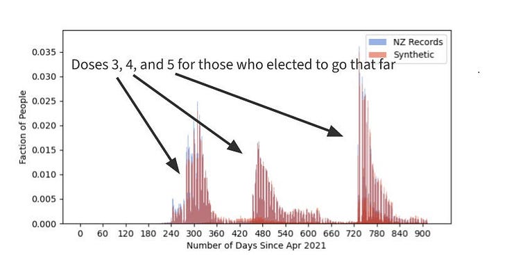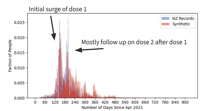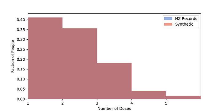 About 40% of the people got 1 dose, 35% 2 doses, less than 20% 3 doses, and so on. The distributions are the same in the data and the synthetic data.