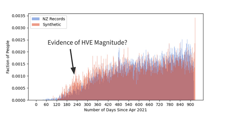My favorite plot is Fig. 2. I know there can be some issues because this is only considering dead people, but the synthetic data can also help normalize for that. I think this one very clearly shows that people die sooner post vaccine. The red bars are flat (plus Poisson noise), that’s what you’d expect to see if the vaccine were a placebo, but we see blue way above red early on because the vaccine is pulling deaths forward. It falls below red because we’re running out of people (as people die and no new people enter the data set eventually the death count gets to 0 at the end).