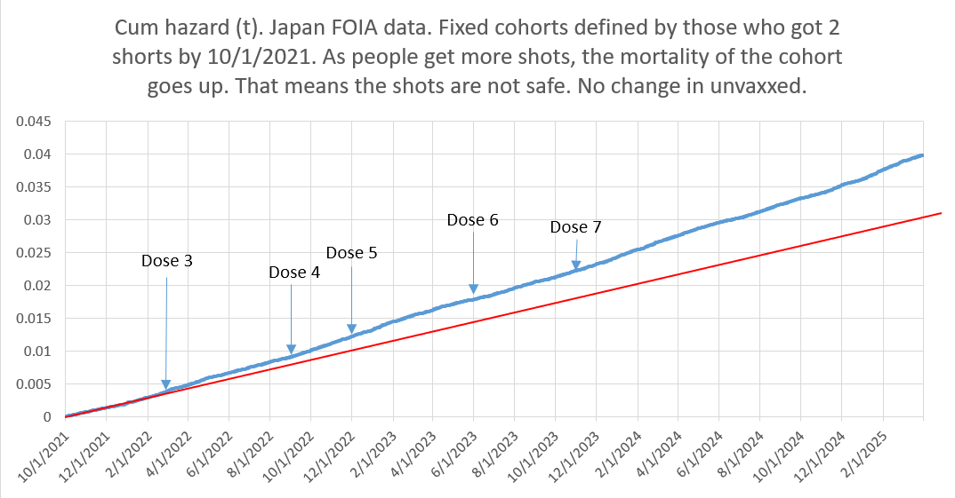 But look at what it looks like for those who got 2 shots. See the difference? The unvaccinated is a straight line. The dose 2 line is straight but then diverges as people in the group get the life saving shot. If the shot saves lives, it should diverge downwards, not upwards. There aren’t two ways to spin this; it’s a fixed cohort. Even if you gave it to the least healthy people, it is supposed to reduce mortality, not increase it.