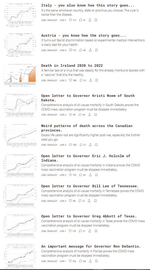 Recently, he wrote a whole series of articles (ending Jun 5, 2022) looking at excess deaths in various places.