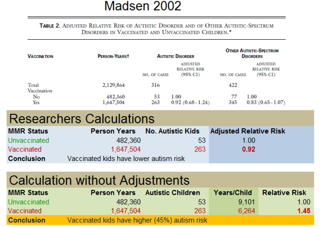 I’d like to address each and every one of the points in Turtles All the way Down pages 162-167, especially the part about the raw data in Table 2 showing there is an effect and then, after magical “adjustments” that are never explained, the signal goes away. Based on the raw numbers, the rate of autism was 45% higher in the vaccinated group than the unvaccinated group, but the paper didn’t mention that at all which is unethical since the adjustments reversed out what the raw data said. You said there was “strong evidence.” It feels like you use the mysterious adjustments to make the signal go away. Also, there were so few cases, why didn’t you verify with the HCP every single case?