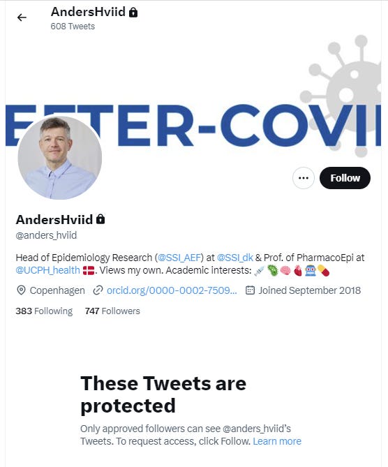 Hviid and his colleagues chose a study design that was designed to look credible but obscure any signal. So when they found no signal they could claim victory, that there was “no association.” They will not supply the underlying data to anyone for either study. So we have to trust them completely on what they say because we aren’t allowed to see the data and analyze it. Get it?
