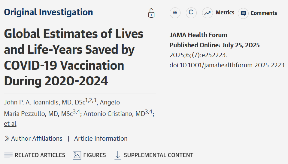 The new Ioannidis paper, Global Estimates of Lives and Life-Years Saved by COVID-19 Vaccination During 2020-2024, claims that the COVID-19 vaccinations averted 2.5 million deaths during 2020-2024 (sensitivity range estimates, 1.4-4.0 million) and saved 15 million life-years (sensitivity range estimates, 7-24 million life-years.