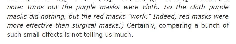 Agrees with the other analyses. The author (Ben Recht, an associate professor at UC Berkeley) actually got the source data from the authors. There is no measurable effect here. The cloth masks were purple and red. The surgical masks were blue and green. Red (cloth) masks worked well. But purple (cloth) masks didn’t work at all. And surgical masks were in between the two. In short, it’s random noise. Get it? It’s all noise.The cult of statistical significance and the Bangladesh Mask RCT (Nov 29, 2021)