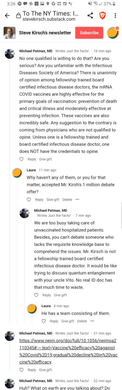 Michael Patmas, MD says that only people with CREDENTIALS are qualified to opine on infectious disease issues
