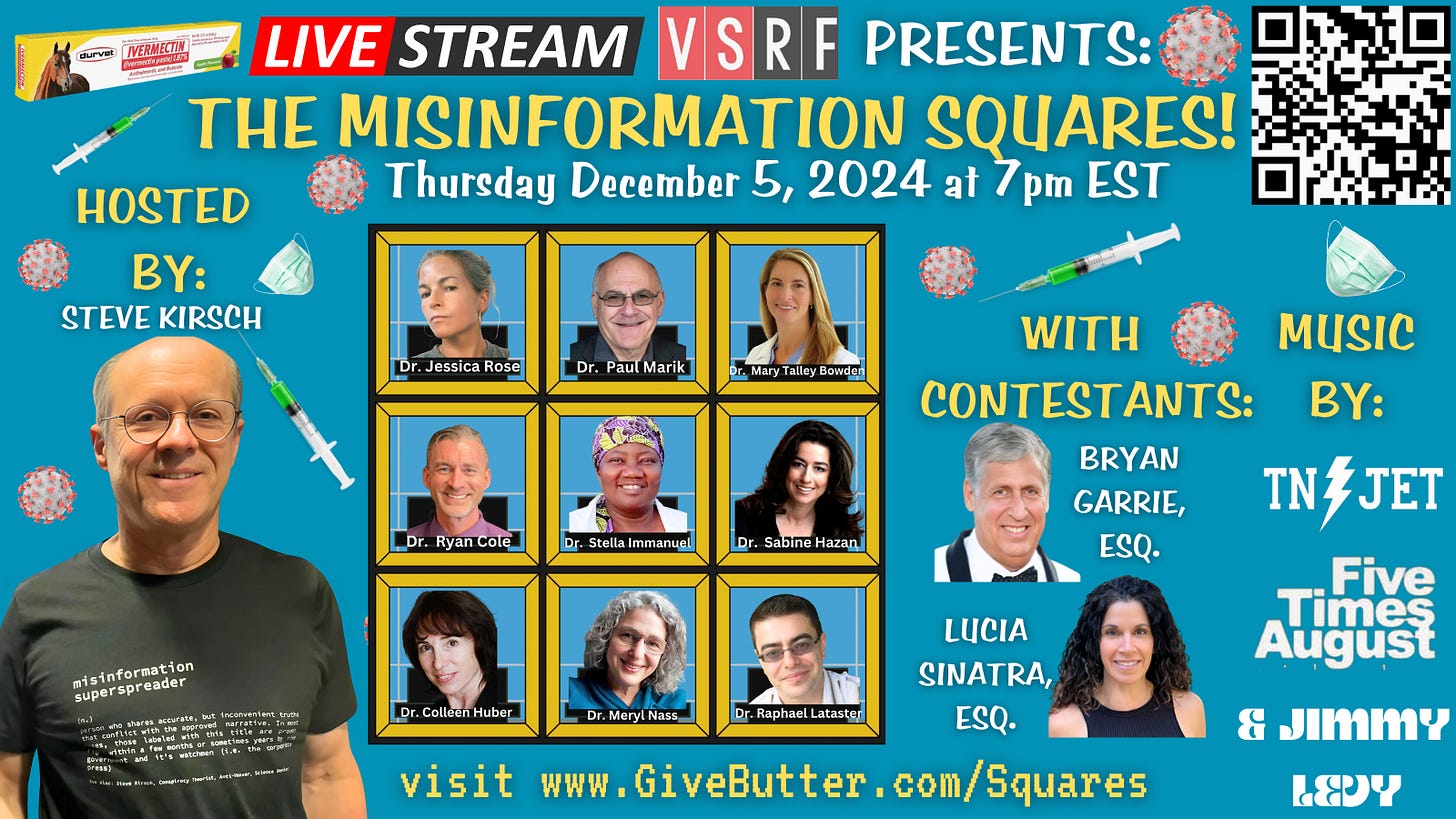 This year will be a fun game we call “Misinformation Squares” on Thursday 12/5/2024 at 7:00 PM Eastern Time on VSRF Rumble and X. The game squares are filled with vaccine-aware doctors that we all know and love, with two knowledgeable lawyers as contestants! Of course, the host will be VSRF Founder and Misinformation Superspreader Steve Kirsch! Who knows what he’s going to say? It’s going to be interesting; we know that. Questions, zingers, and answers will be flying in all directions!