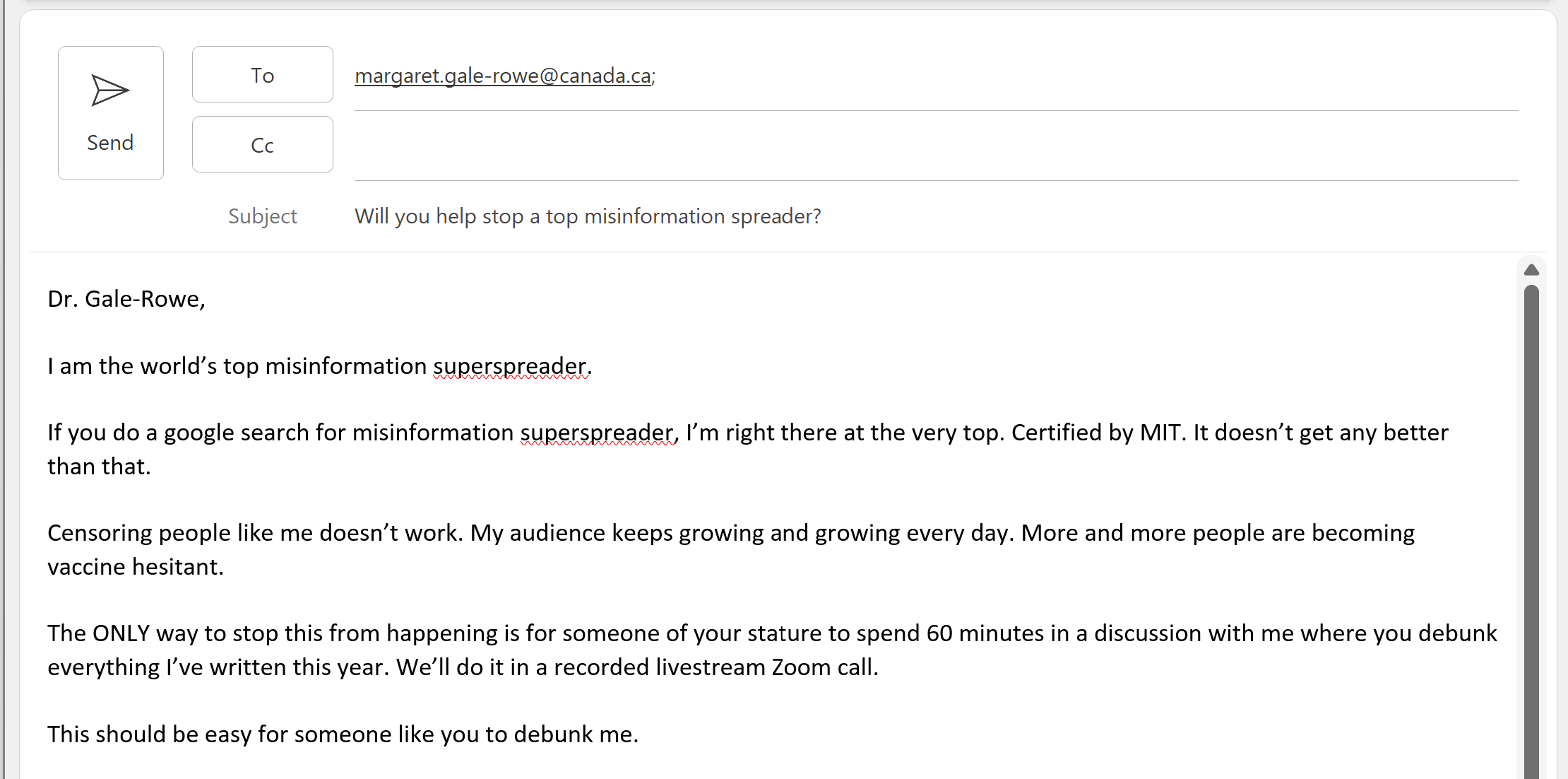 I can be reached at <redacted>. I very much look forward to hearing from you. You will be a world hero for stopping me as nobody has dared to challenge me on any vaccine safety issues since I started speaking out more than a year ago.