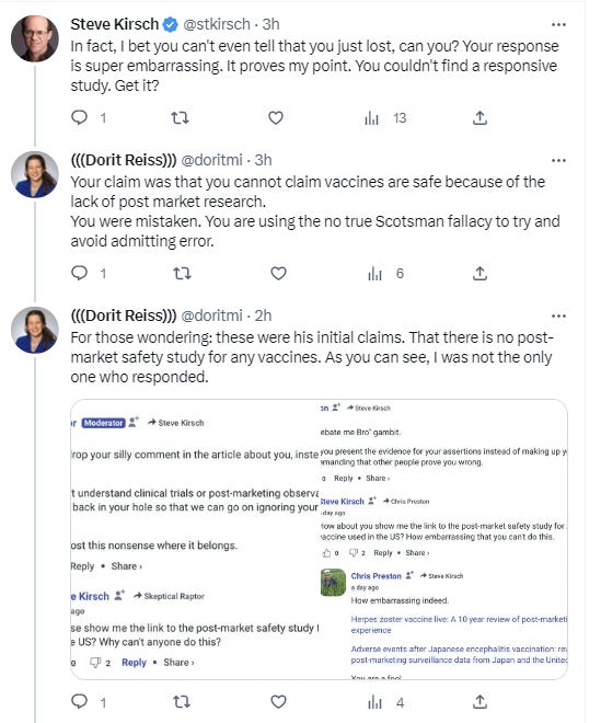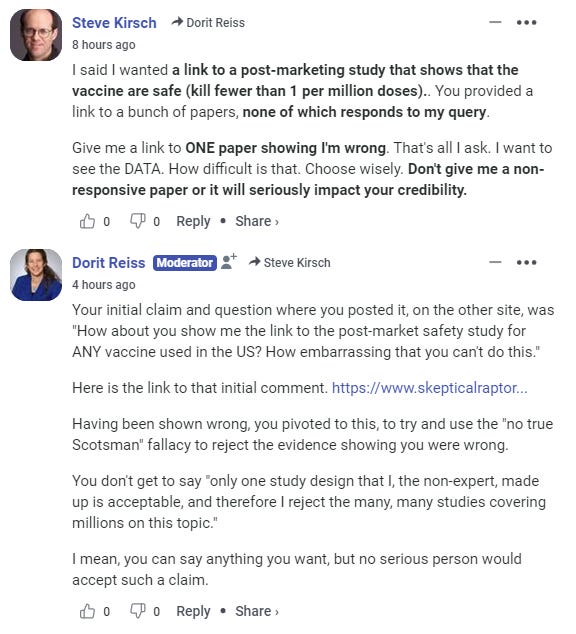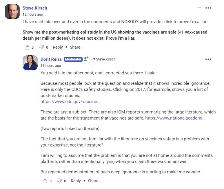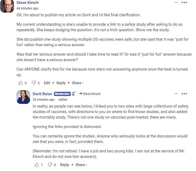So the study she supplied was just so deficient on so many levels. It shouldn’t be taken seriously even for the age group. Yet Dorit appeared to have absolutely no problem citing this study as proof the vaccines are safe! And none of her readers had a problem with the paper either.