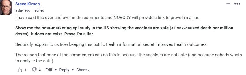 So I challenged her to show me any objective credible large-scale, post-marketing US study showing that any of the vaccines in the US are “safe” as defined by Paul Offit back in 2002 as fewer than 1 death per million doses.
