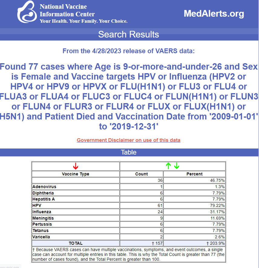In the VAERS search below, the ratio of deaths between the flu vaccine vs. the HPV vaccine is 2.5X higher risk whereas in the Table above it’s 2.9X higher risk so they are in the same ballpark. So the magnitude and direction is consistent: HPV is way more deadly than the flu shot. At least they got that right!