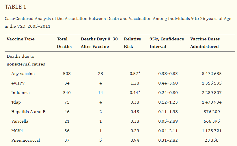 This table shows that taking any vaccine (except for the HPV vaccine which is super deadly) makes you less likely to die compared to not taking the vax: it cuts your risk in half (plus or minus). There is no way this is possible. This is crazy stupid. For the MCV4 vax, you’re looking at a 71% reduction in risk of death.