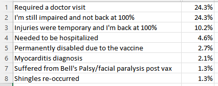 I've updated the text to give the number of people in the survey and also point out that my readers give LOWER vax injury rates than the general population, so my reader surveys should be considered to be conservative estimates.