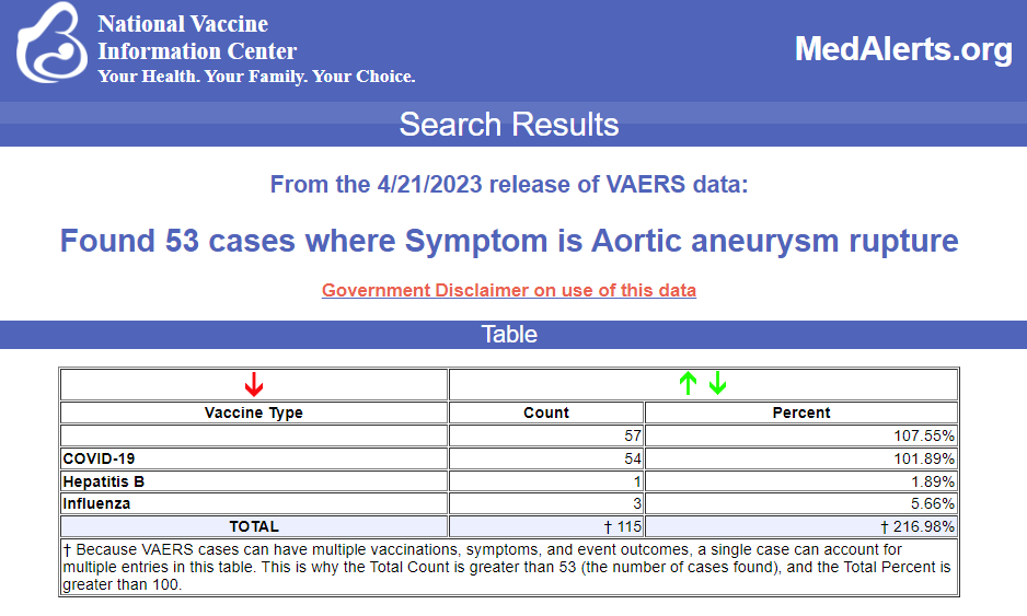 AP News said it couldn’t be caused by the COVID vaccine, even though a search of VAERS for the past 30 years for all vaccines shows that the only vaccine linked to aortic aneurysm is the COVID vaccine: