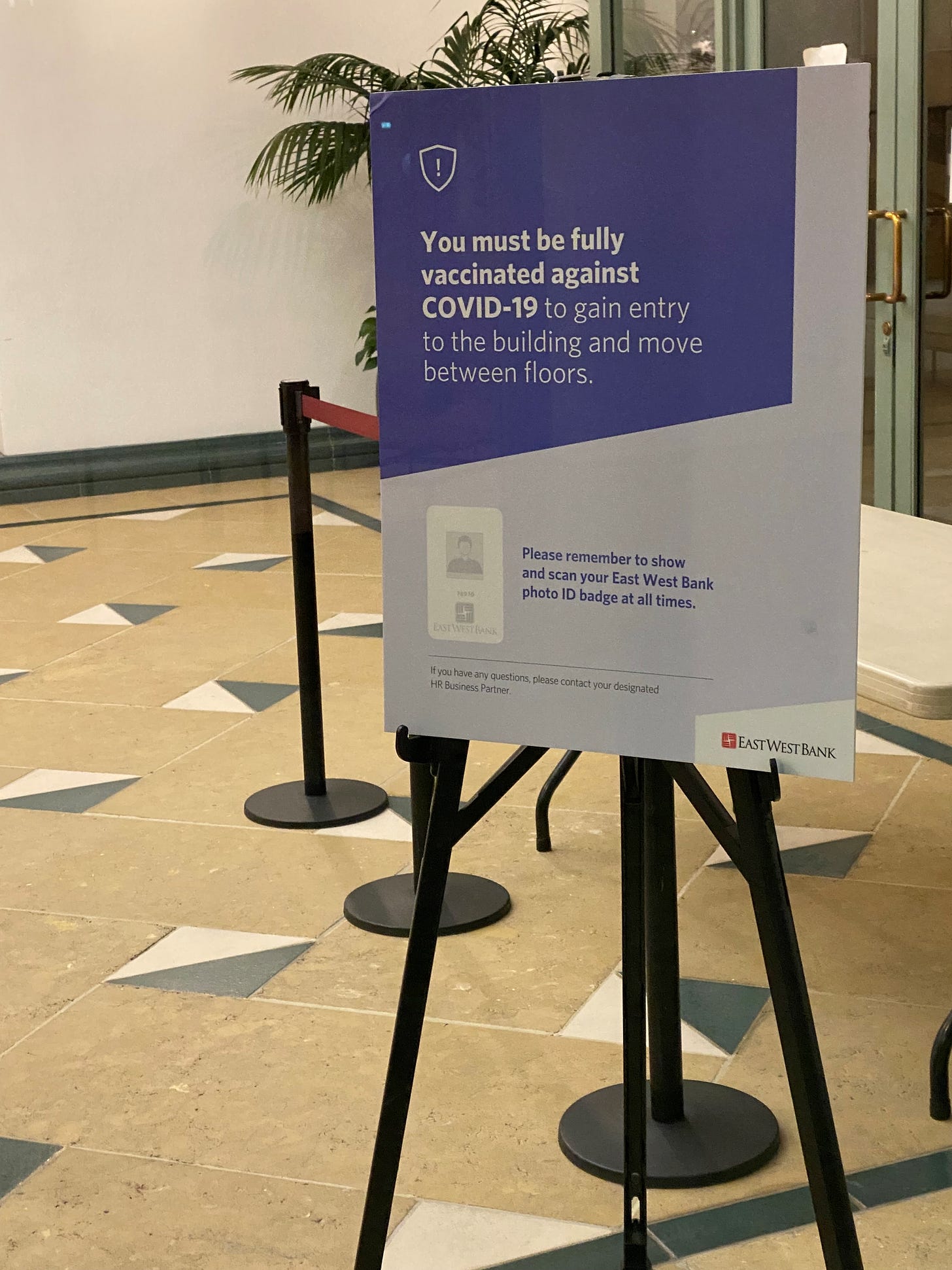 This sign that I noticed in the lobby of the EastWest Bank in Pasadena says it all: you must be fully vaccinated against COVID-19 or you can’t enter the building.
