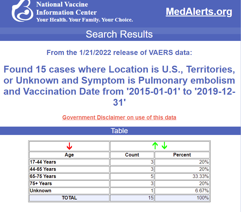 Pulmonary embolism happens 15 times in 5 years. So that’s an average of 3 reports per year from all vaccines: