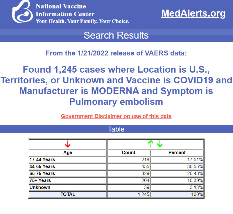 For example, according to VAERS US data, the average rate of pulmonary embolism reports is just 3 per year. With Moderna, we have 1,245 events. 415X normal. How can that not be flagged as an adverse event? The only way that can happen is if the people who are in charge of monitoring the safety signals are either blind or corrupt. The public is not being informed of hundreds of safety signals like this.