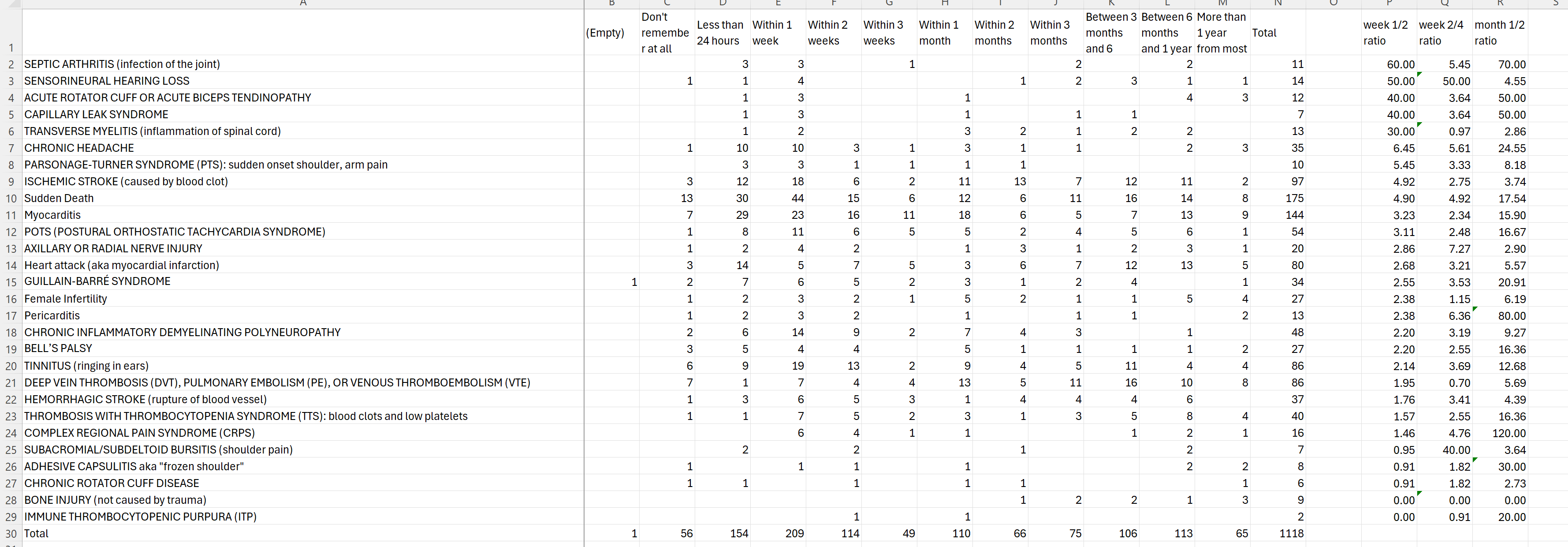 Steve, I went into the 1,157 records and could not help but notice the large number of them that are "blood clot related." If you add up the 100 Ischemic Strokes, 40 Hemorrhagic Strokes (clot causes the blood vessel to burst), 40 Thrombosis with Thrombocytopenia, 88 Deep Vein Thrombosis cases, then you get 268 total cases (23%) that are "blood clot related." If you then add in the 81 Heart Attacks that can also be caused by blood clots, you get 349 cases (30%) out of the total 1,157 cases that are "blood clot related."