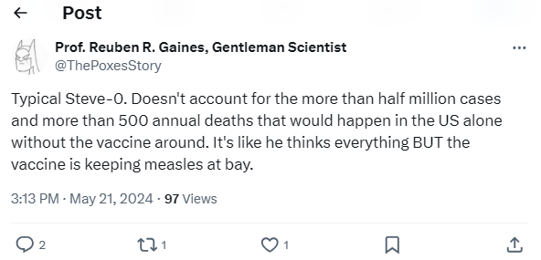 We have an self-proclaimed “expert” on X explain that if we totally stopped all measles vaccination, there would be 500 deaths a year. So that’s the upper bound. This is rounding error compared to other diseases.