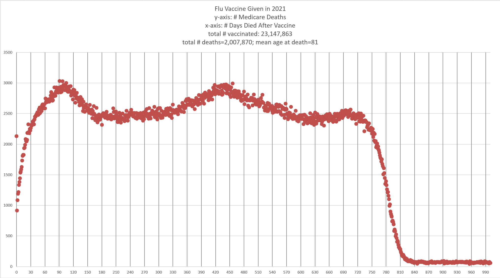 Figure 1 shows the deaths per day for Medicare patients who got the flu vaccine in 2021 (mostly in October). The x-axis is the days after the shot was given. The y-axis is the deaths on that day.