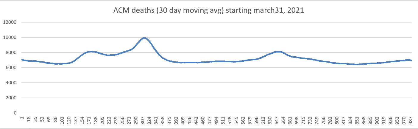 As you can see from the graph, we have an instant problem because the baseline numbers after the first seasonal peak is at least 1,093 deaths per day, a whopping 38% increase in the baseline death rate after someone has been vaccinated.