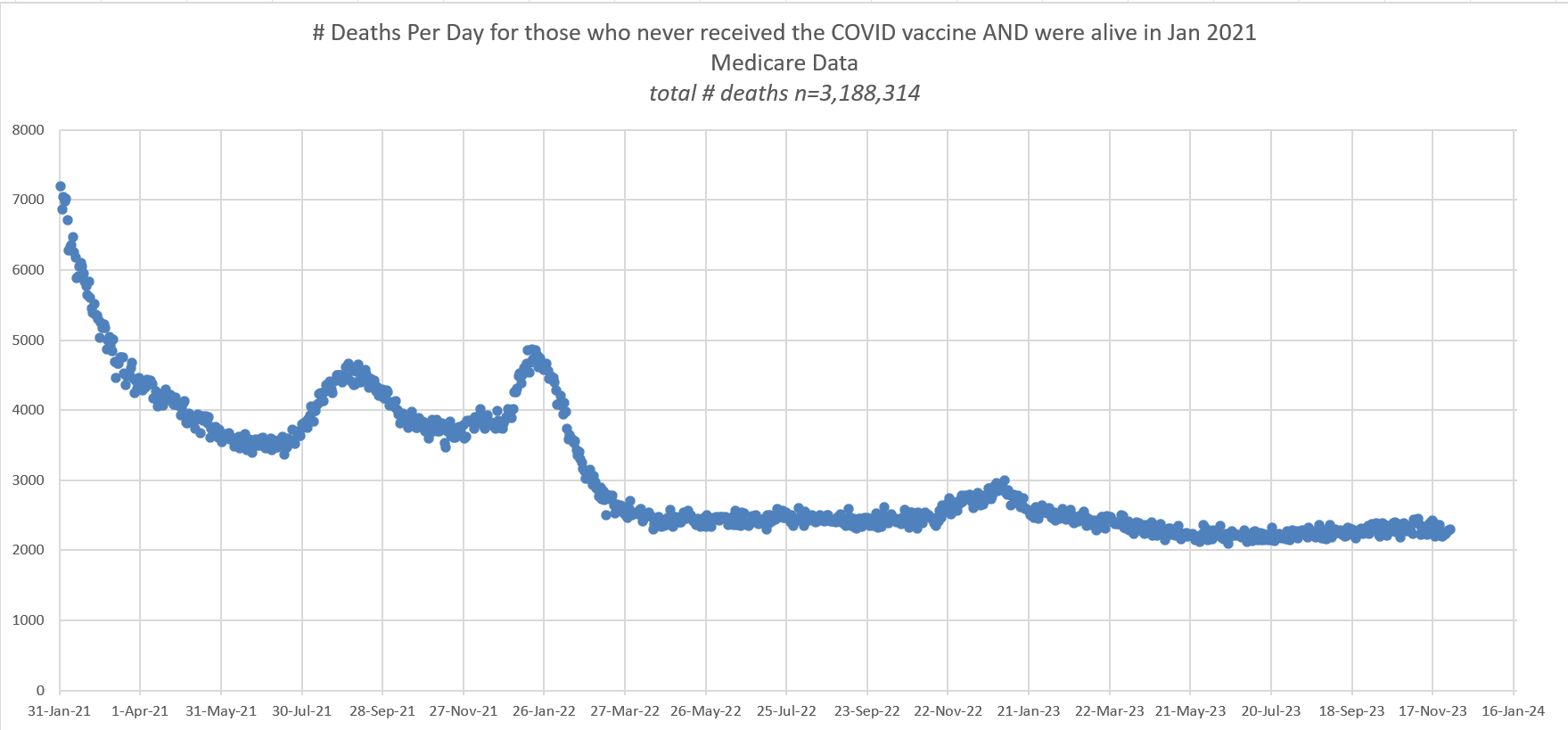 Our final figure is deaths of people who didn’t get a vaccine in 2021 onwards and died. This wasn’t the ideal criteria because it is “forward looking” rather than specifying a more objective criteria such as “not being vaccinated by the end of 2021.”