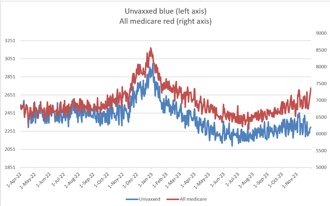 The seasonal mortality peak in the chart above at the end of 2022 is 2913 vs. an earlier baseline (July 2022) of 2456. So the seasonal peak was 18.6% above baseline mortality for the unvaccinated while the seasonal peak was 23% for all of Medicare. So the unvaccinated appear to be less affected by seasonality than the vaccinated.