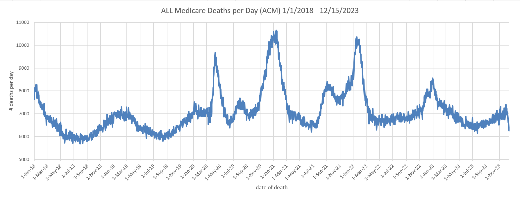 Also, for comparison purposes for use in the next section, the average peak value at the end of 2022 was 8384, which is a 23% increase from the 2022 baseline. So this is the “seasonal mortality” increase.