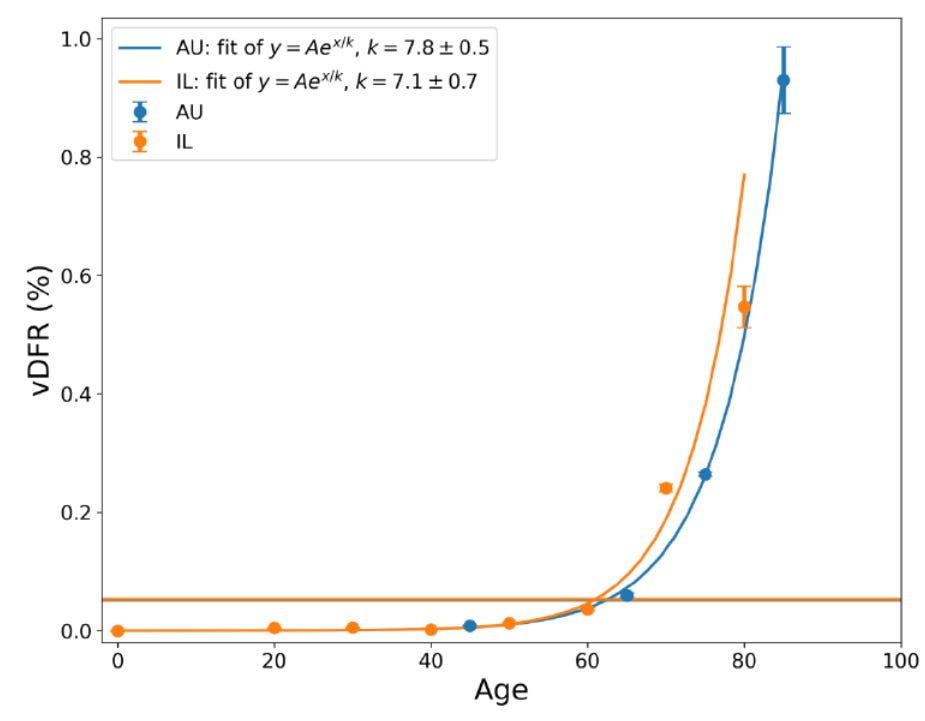 The paper finds that the vDFR (vaccine-dose fatality rate) is exponential with respect to age.