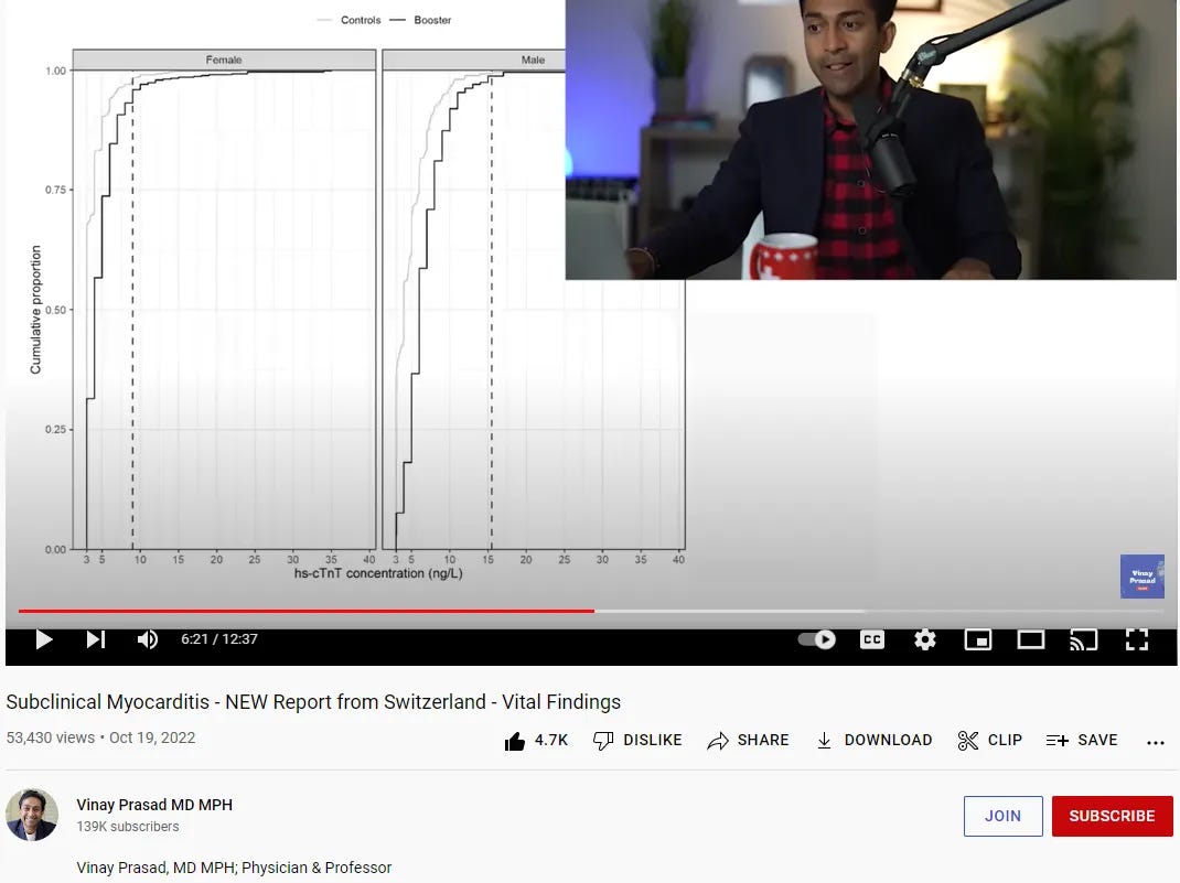 Furthermore, the rate of sub-clinical myocarditis in boys in the Thailand study (summarized at 2:47 in the video) is 3.5%, i.e., 1 in 28 boys will have subclinical or overt myocarditis.