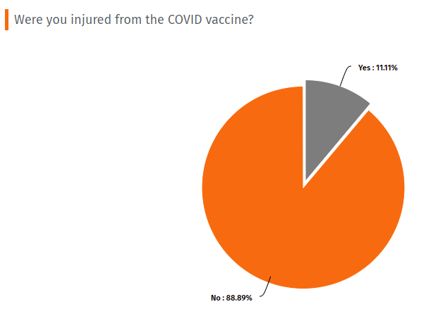 11% of the people we polled who received a vaccine believed they were vaccine injured. That translates to over 20 million vaccine injured people. This is consistent to the 8% who sought medical care in the v-safe data (which is a higher standard of injury so a lower number is expected).
