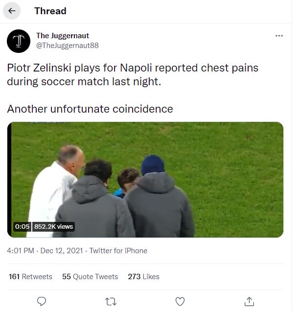 Update 12/22/21: Twitter says all these events of athletes collapsing or dying are due to dehydration and overheating… in winter. I’m serious. Check this out.