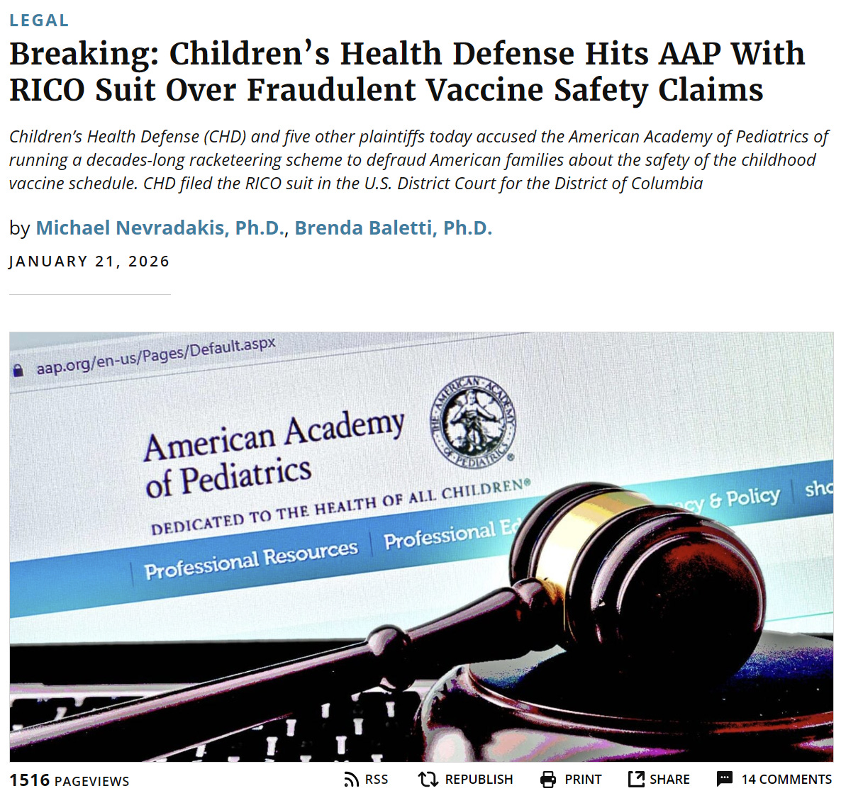 CHD article: Breaking: Children’s Health Defense Hits AAP With RICO Suit Over Fraudulent Vaccine Safety Claims