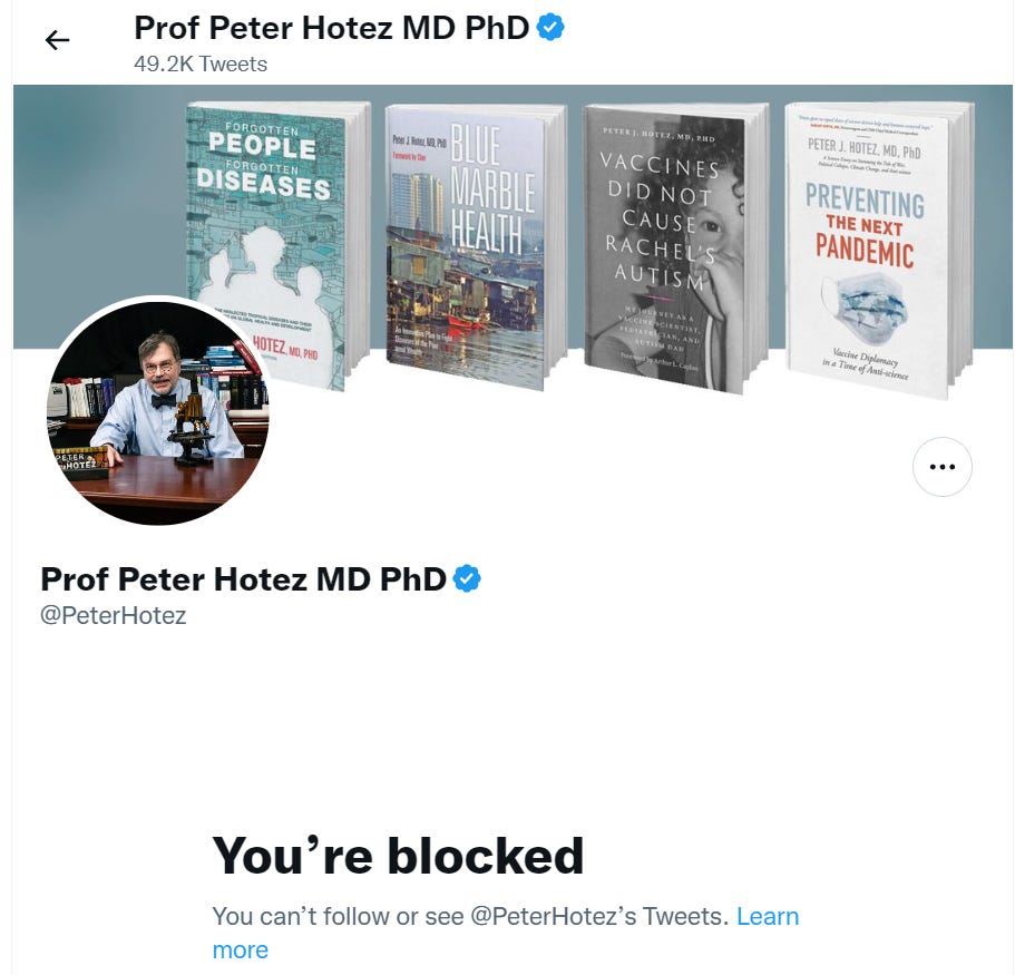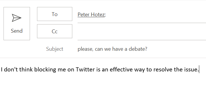 Peter’s Twitter is @PeterHotez. Ask him why he refused to debate me on this question. Maybe he will tell you and I can adjust my approach.