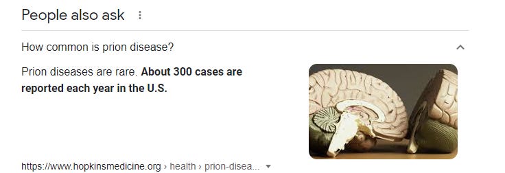 A few months ago I and colleagues spent a week analyzing the results of a large vaccine injury survey Steve Kirsch sent out to his followers. One of the most striking results I found in it was the high rate (typically extremely rare) of prion disease reported by the respondents. This was a huge red flag to all of us (survey results/analysis can be found here: https://amidwesterndoctor.substack.com/p/analysis-of-a-large-vaccine-injury ).