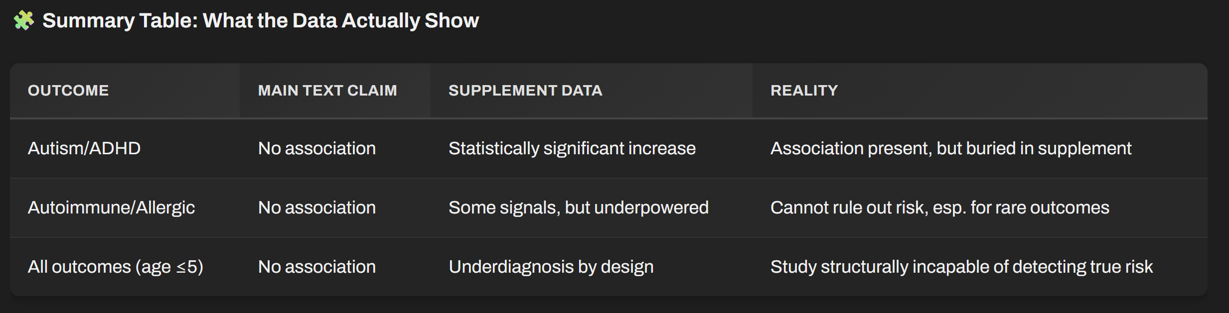 I would like to point out a VERY SIGNIFICANT point here too. If the lower group shows an increased risk this probably means a child was diagnosed with a neurological disorder and the parents seeing the possible connection stopped vaccinating (thus they had a lower exposure) while the higher exposure group didn’t see the connection until it was too late (after the age of 5) and thus their issues were not picked up in the study due to the design.
