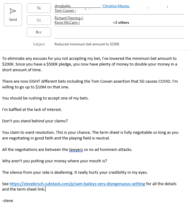All my $1M bet offers still stand. If anyone wants to accept any bet, I promise we will get to a definitive agreement very quickly on my side and settle the issue ASAP by expert scientific judges that the parties mutually agree to and expert scientific testimony.