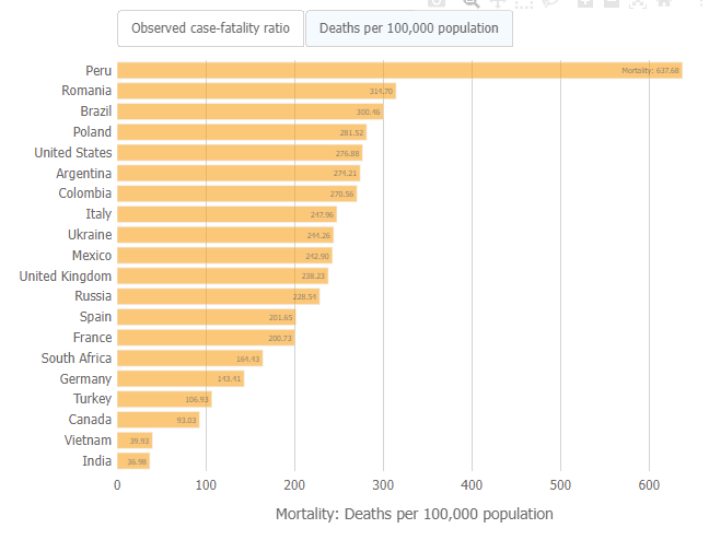 Look at the deaths per 100,000 population numbers from Johns Hopkins for the top 20 countries most affected by COVID: