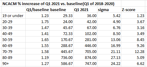 We note that those over 60 years old were prioritized for COVID vaccination in Q1 of 2021. There was a 58% increase in the number of deaths for 70-79 year olds for non-COVID deaths. The Z-score was 12.3 which indicates that the increase was highly statistically significant.