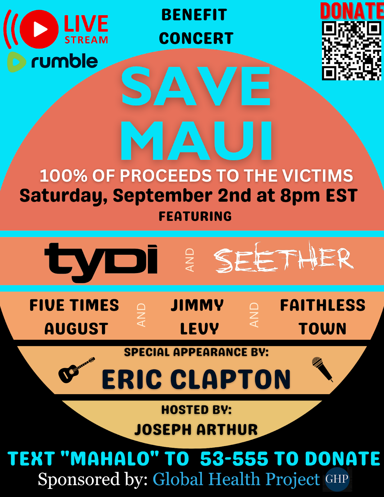 Amidst the tragedy in Lahaina, the Health Freedom Movement is stepping up to help. Led by the Global Health Project, this Saturday, September 2nd at 8 PM ET | 5pm PT on the VSRF Rumble Channel, a global live music event will be broadcast to provide real support to families affected by these fires. Our friends, Five Times August, Jimmy Levy, Tydi, Seether, Faithless Town, and Joseph Arthur will be performing, as well as a special performance by Eric Clapton.