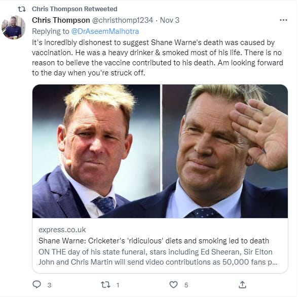 He apparently has few followers judging by this post where he proclaims with great certainty that “there is no reason to believe that the vaccine contributed to” the death of Shane Warne.