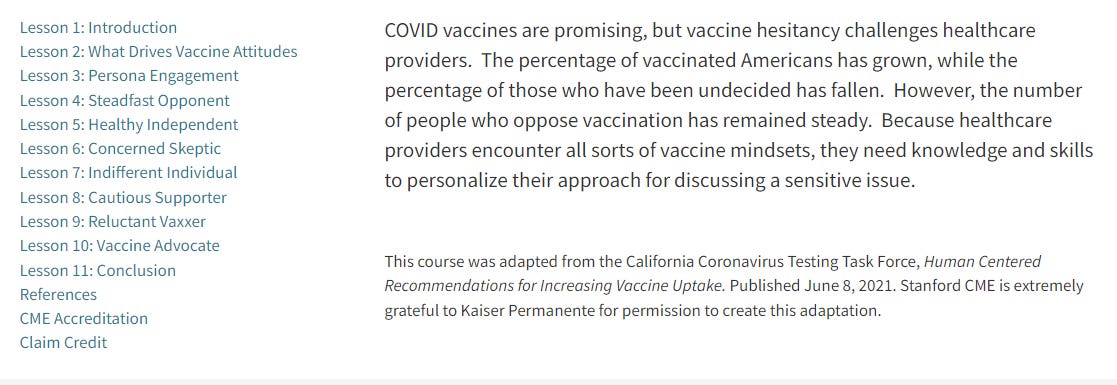 I found a Stanford course used to train doctors worldwide on how to overcome vaccine hesitancy. Basically, they tell doctors to give false information. They truly believe the false narrative.