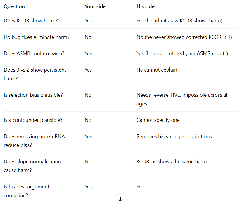Epidemiologists hate KCOR because it's an unbiased estimator of the truth. My opponent was highly incentivized with millions of dollars to find a hole in the KCOR methodology. He failed.